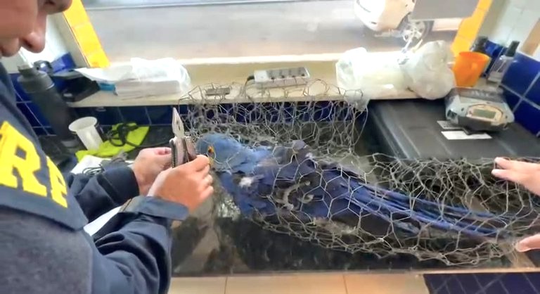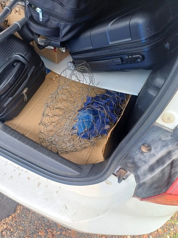 “Durante a vistoria no porta-malas, foi localizada uma arara-azul sendo transportada de forma precária e cruel, sem qualquer autorização ambiental. O animal apresentava sinais evidentes de maus-tratos, incluindo o bico serrado”, afirmou.