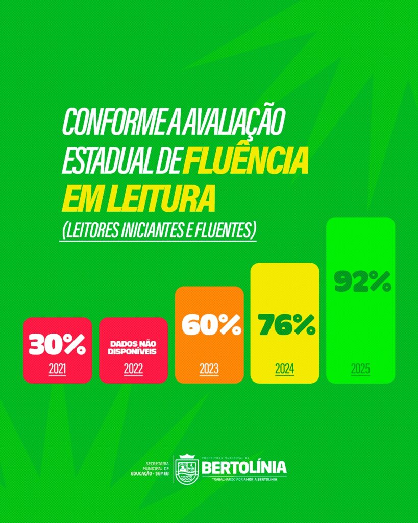 A educação pública de Bertolínia segue apresentando avanços significativos. De acordo com dados da Avaliação Estadual de Fluência em Leitura, o município atingiu 92% de fluência leitora em 2025, considerando alunos leitores iniciantes e fluentes da rede municipal de ensino.
