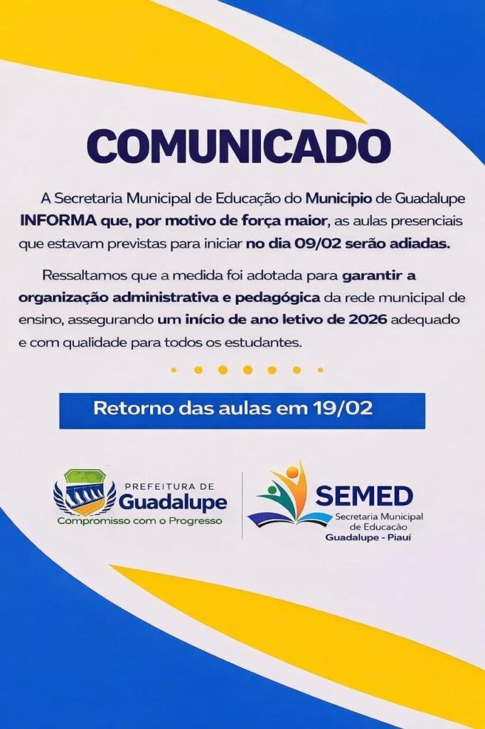 A Prefeitura de Guadalupe, por meio da Secretaria Municipal de Educação (Semed), anunciou oficialmente o adiamento do início das aulas na rede municipal de ensino. O retorno, que estava previsto para a próxima segunda-feira, 9 de fevereiro, foi transferido para 19 de fevereiro.
