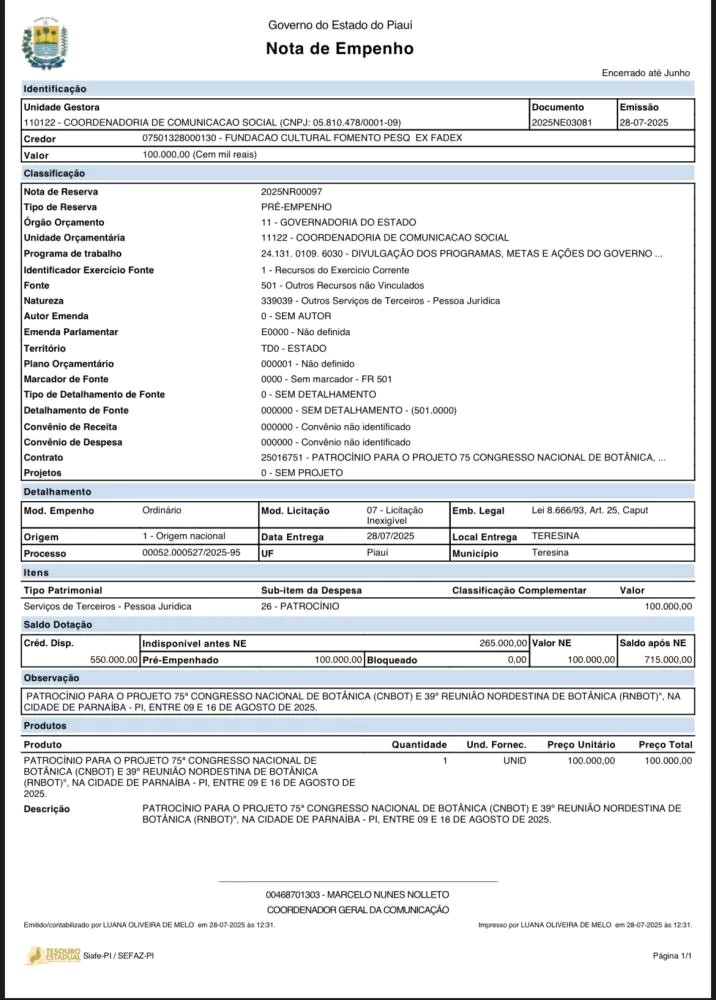 A nota — identificada pelo número 2025NE03081 — tem como objeto o patrocínio do “75º Congresso Nacional de Botânica (CNBOT) e 39ª Reunião Nordestina de Botânica (RNBOT)”, a ser realizado em Parnaíba entre os dias 9 e 16 de agosto de 2025. No campo “Detalhamento”, o documento traz a seguinte justificativa: