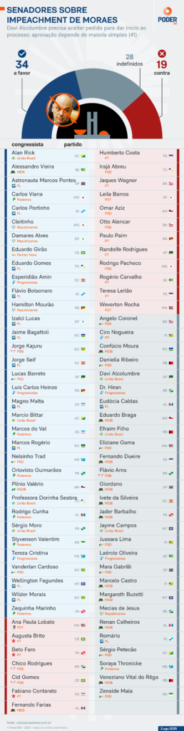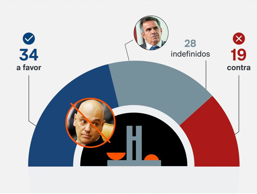 O senador Ciro Nogueira (PP-PI), um dos principais aliados do ex-presidente Jair Bolsonaro e ex-ministro da Casa Civil, aparece como indefinido no levantamento de votos dos senadores sobre um eventual processo de impeachment do ministro do Supremo Tribunal Federal (STF) Alexandre de Moraes. O placar, divulgado pelo site votossenadores.com.br e compartilhado pelo deputado federal Nikolas Ferreira (PL-SP), mostra que até agora 34 senadores se posicionaram a favor do impeachment, 19 contra e 28 ainda não declararam voto.