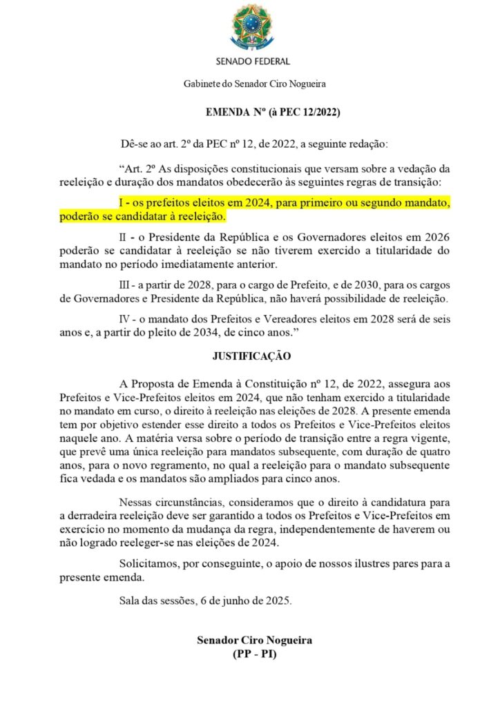 O senador Ciro Nogueira (PP-PI) apresentou uma emenda à Proposta de Emenda à Constituição (PEC) nº 12/2022 com o objetivo de assegurar o direito à reeleição, em 2028, a todos os prefeitos eleitos no pleito municipal de 2024 — mesmo àqueles que já estiverem exercendo o segundo mandato consecutivo.