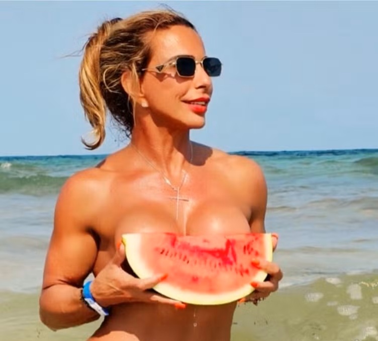 A influenciadora Andréa Sunshine, também conhecida como “vovó fitness” está curtindo férias em Ibiza, famosa ilha espanhola. A ex-fisiculturista, de 55 anos, posou completamente nua no mar e cobriu o corpo apenas com uma fatia de melancia. Os cliques fizeram sucesso e ela explicou que fez os registros para celebrar os resultados do seu esforço na rotina fitness.