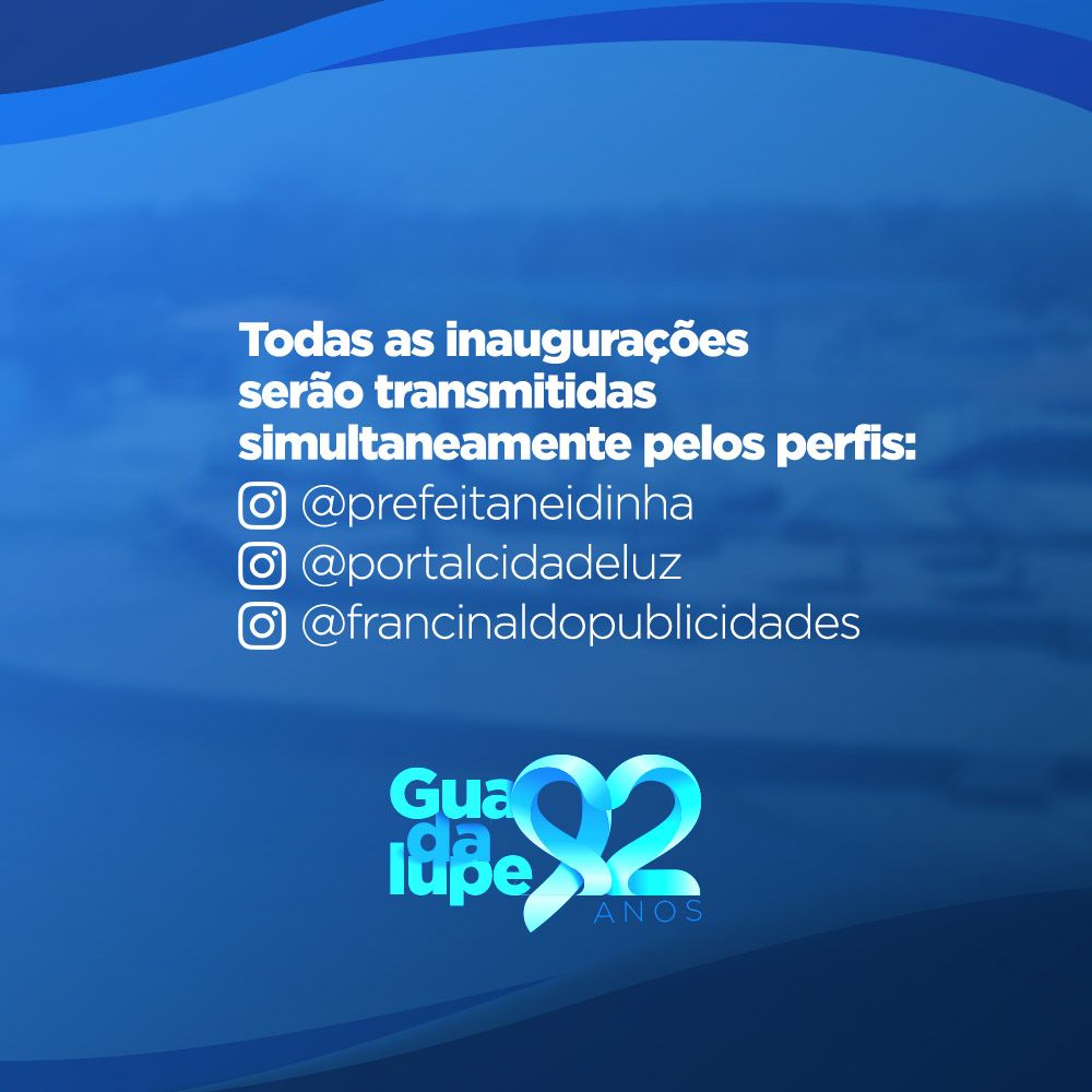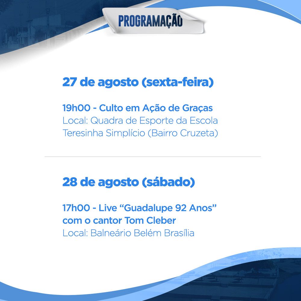 Neidinha Lima disse ao Portal Cidade Luz que a data é 25 de agosto, porém, como são muitas atividades, (Inaugurações, Missa, Culto, Lives e outros) a gestão montou um calendário com programação que começa nesta quinta-feira (19) e segue até 28 de agosto.