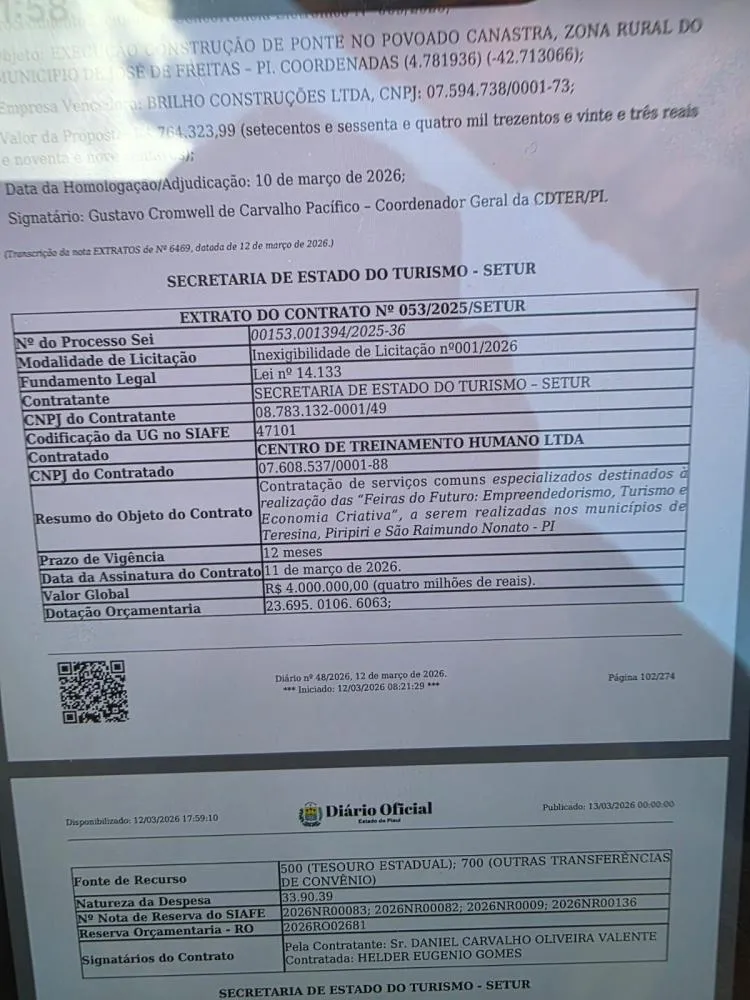 O Governo do Piauí firmou, no último dia 11 de março de 2026, um contrato no valor de R$ 4 milhões com a empresa Centro de Treinamento Humano Ltda., reforçando a presença recorrente da companhia em contratações públicas estaduais. A data do acordo não passou despercebida: coincide com o aniversário do empresário Helder Eugênio Gomes, que consta como representante legal da empresa no documento oficial.