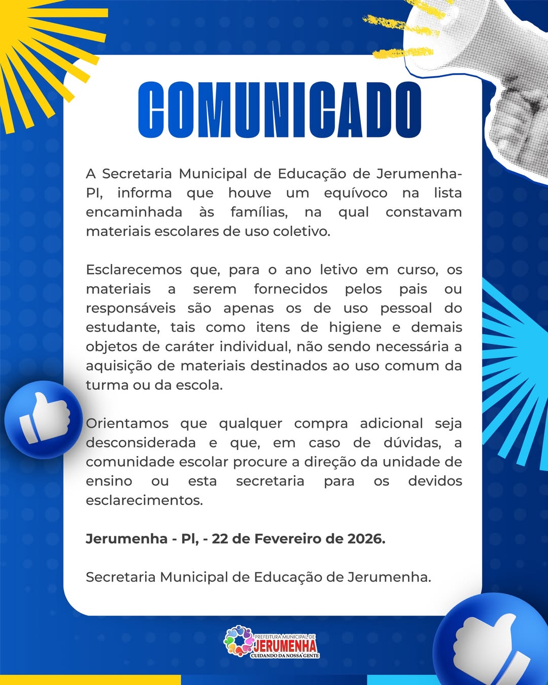 A Secretaria Municipal de Educação de Jerumenha divulgou, neste domingo, 22 de fevereiro, um comunicado oficial informando a ocorrência de um equívoco na lista de materiais escolares encaminhada às famílias dos estudantes da rede municipal de ensino.