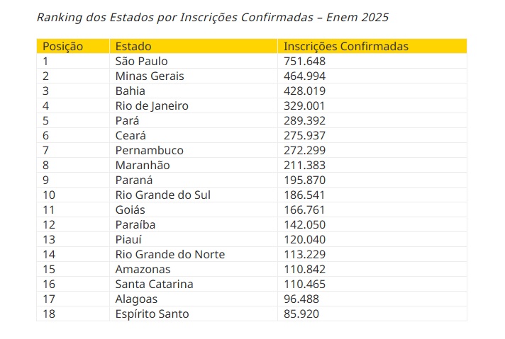 No ranking por estados, o destaque vai para São Paulo, com 751.648 inscritos, seguido por Minas Gerais, 464.994; e a Bahia, com 428.019.