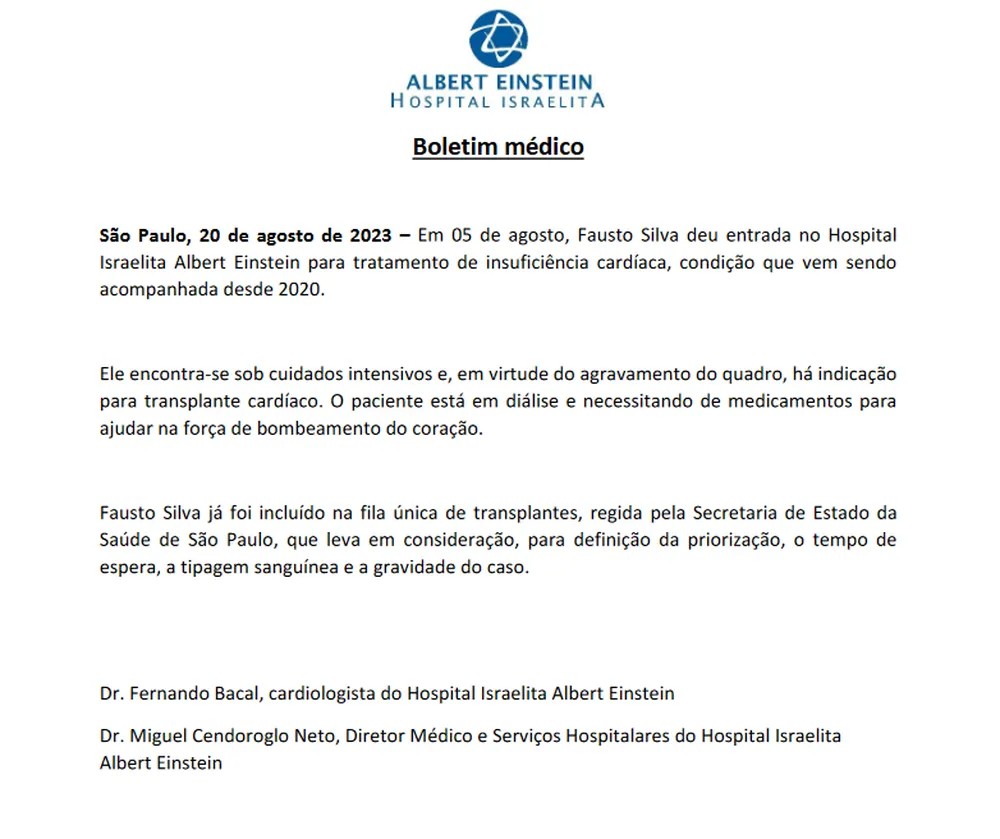 O apresentador Fausto Silva passou por um transplante de fígado e retransplante renal, informou o boletim médico divulgado na noite desta quinta-feira (7) pelo Hospital Albert Einsten, em São Paulo.