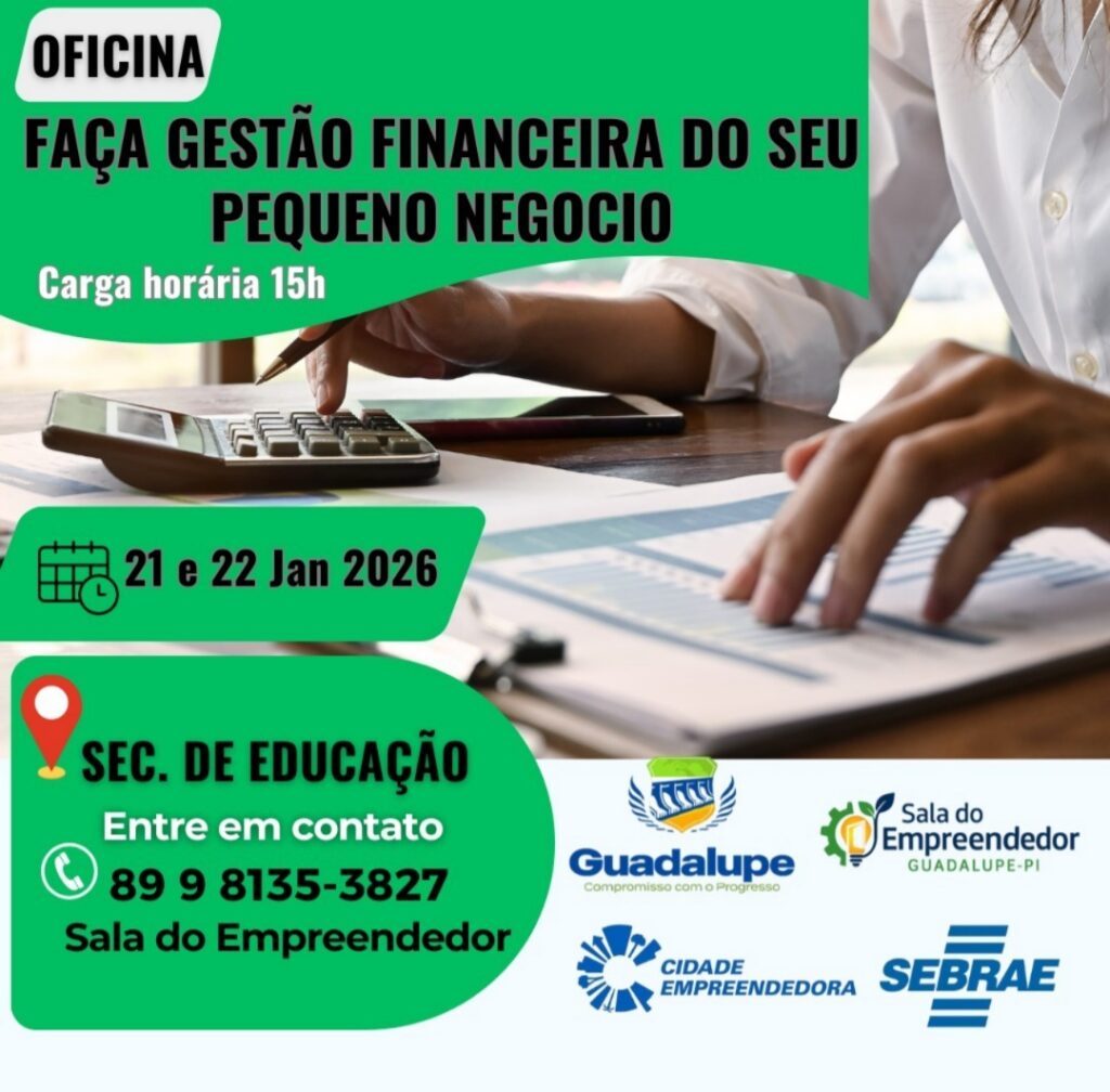 A Prefeitura de Guadalupe, por meio da Sala do Empreendedor, realizará nos dias 21 e 22 de janeiro de 2026 a oficina “Faça a gestão financeira do seu pequeno negócio”, voltada para empreendedores que desejam aprimorar o controle financeiro, organizar gastos e tomar decisões mais seguras na condução de seus negócios.