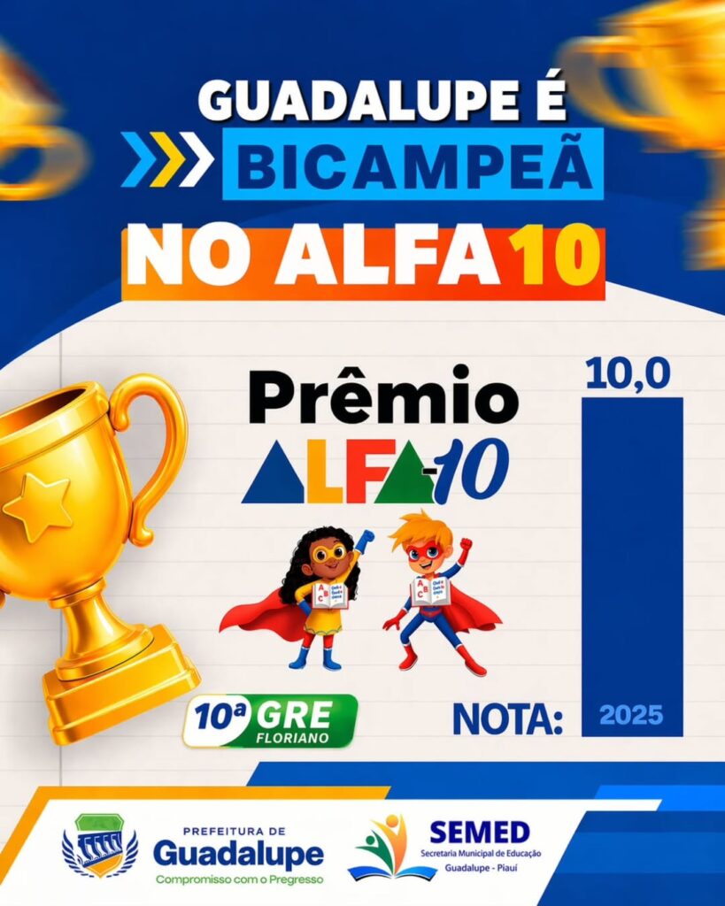 O município de Guadalupe voltou a se destacar no cenário educacional do Piauí ao conquistar, pela segunda vez consecutiva, o Prêmio Alfa-10, reconhecimento concedido às redes de ensino que alcançam resultados de excelência no processo de alfabetização das crianças.