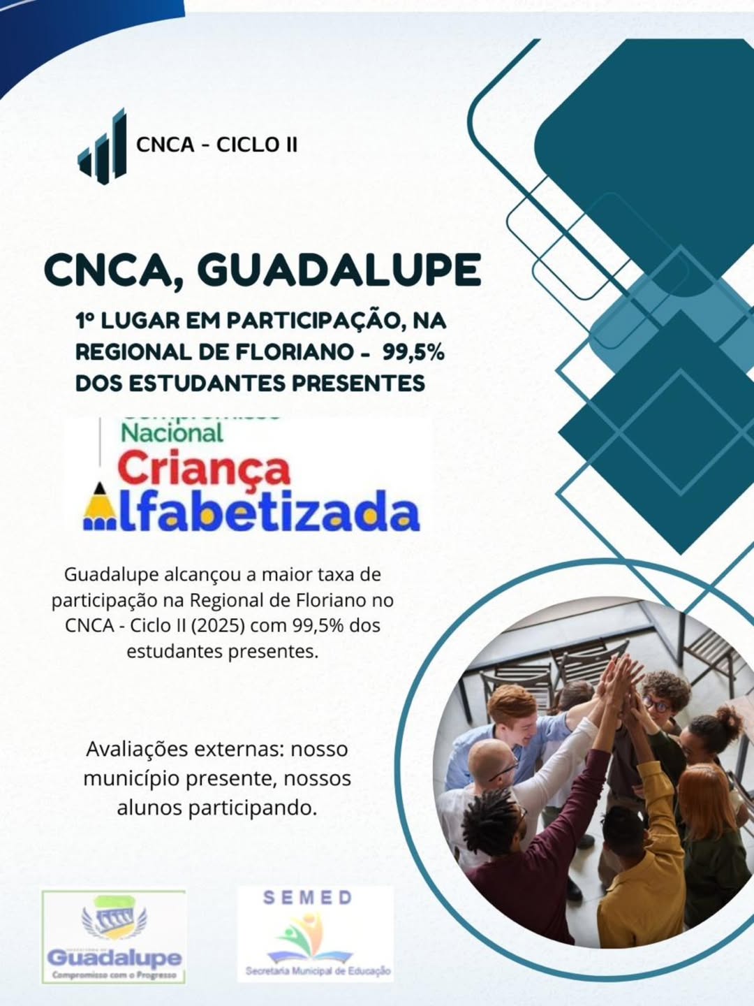 Guadalupe conquistou o 1º lugar em participação no CNCA – Ciclo II (2025), na Regional de Floriano, registrando 99,5% de presença dos estudantes. O resultado reflete a mobilização de alunos, famílias e profissionais da educação no processo avaliativo.