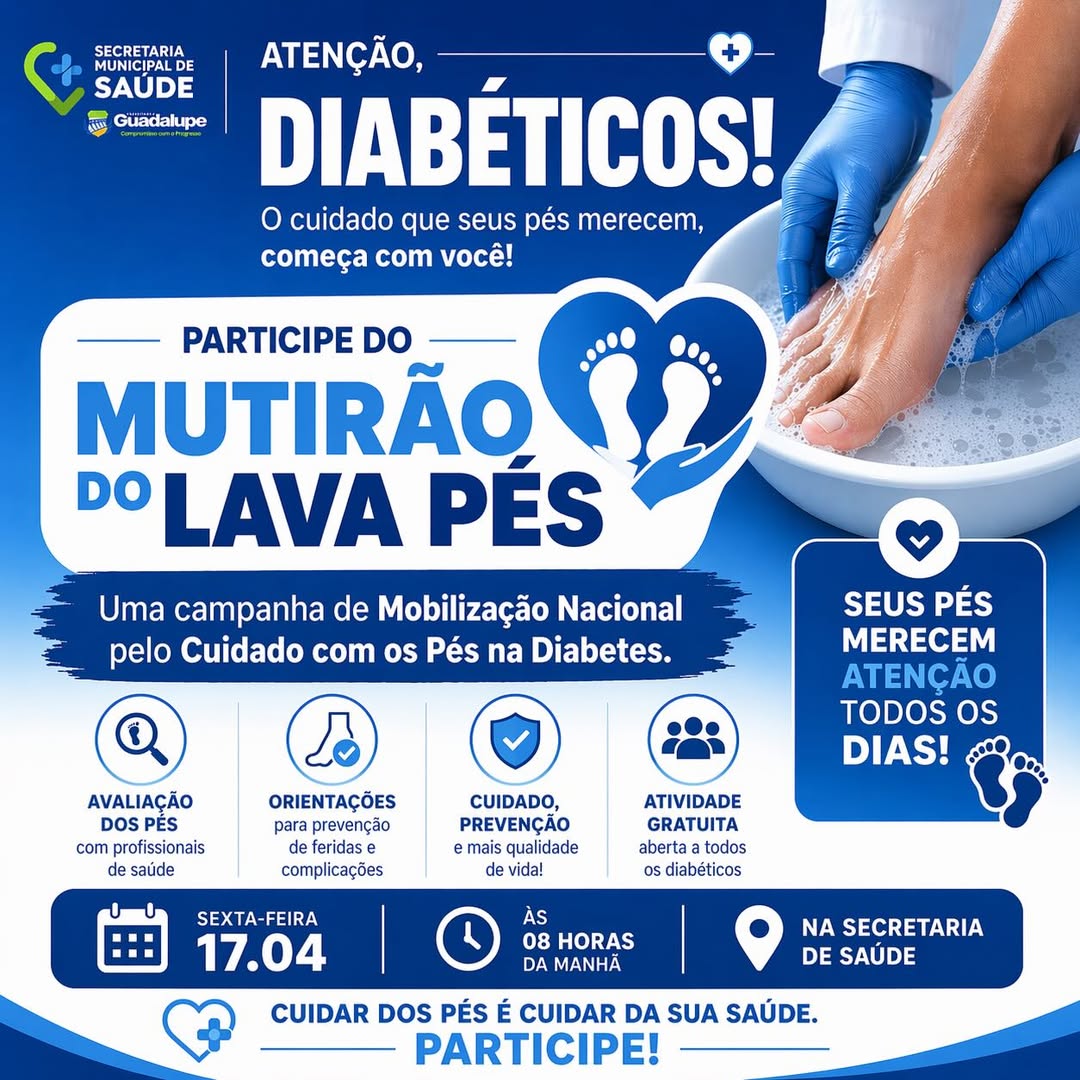 A Prefeitura de Guadalupe, por meio da Secretaria Municipal de Saúde, realizará nesta sexta-feira, 17 de abril, o Mutirão do Lava Pés, ação voltada ao público diabético do município. O atendimento acontecerá a partir das 8h, na sede da Secretaria Municipal de Saúde.