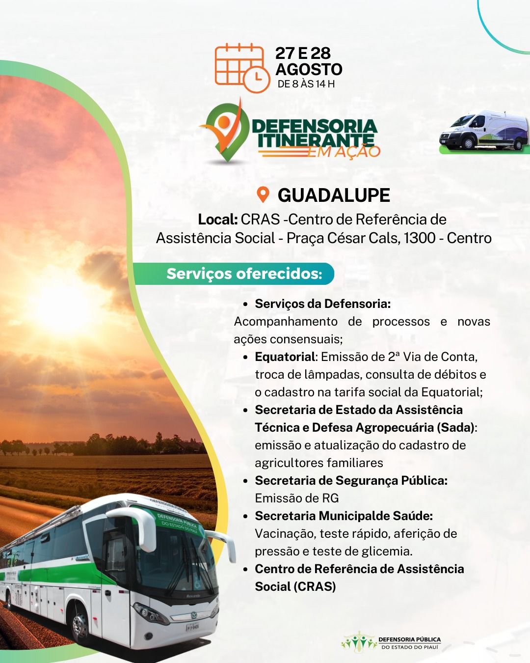 A cidade de Guadalupe vai receber, nos dias 27 e 28 de agosto, a ação Defensoria Itinerante em Ação, que oferecerá uma série de serviços gratuitos à população. O atendimento será realizado no CRAS – Centro de Referência de Assistência Social, localizado na Praça César Cals, 1300, no Centro, das 8h às 14h.