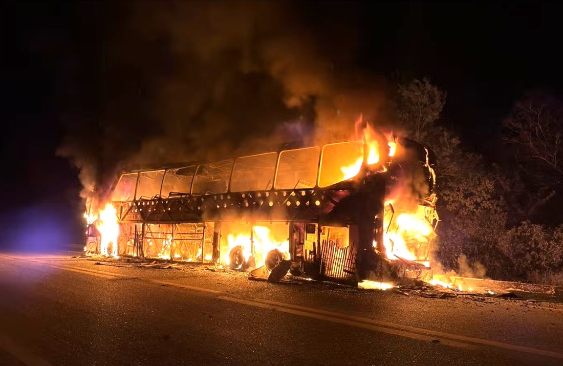 Segundo a Polícia Militar, a ocorrência foi registrada por volta das 18h30, em frente à localidade Santana 1, a cerca de três quilômetros da saída da cidade. O veículo realizava transporte interestadual e foi completamente destruído pelas chamas.