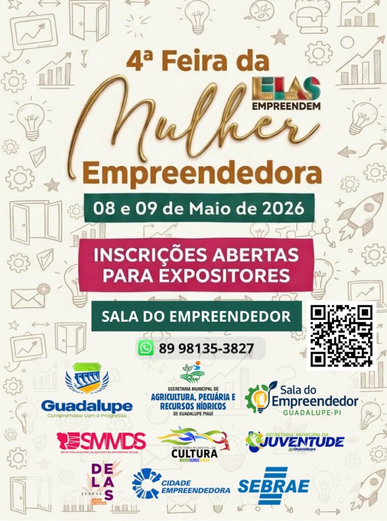 A Prefeitura de Guadalupe anunciou a abertura das inscrições para a 4ª Feira da Mulher Empreendedora de Guadalupe, iniciativa que tem como objetivo valorizar, incentivar e fortalecer o empreendedorismo feminino no município. As inscrições estão abertas a partir desta sexta-feira, 13 de março, e o evento será realizado nos dias 08 e 09 de maio de 2026.