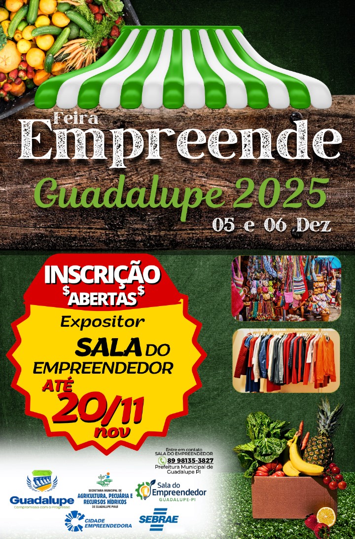 A Prefeitura de Guadalupe, por meio da Sala do Empreendedor e com o apoio do Sebrae, anunciou a abertura das inscrições para expositores interessados em participar da Feira Empreende Guadalupe 2025, que será realizada nos dias 05 e 06 de dezembro.