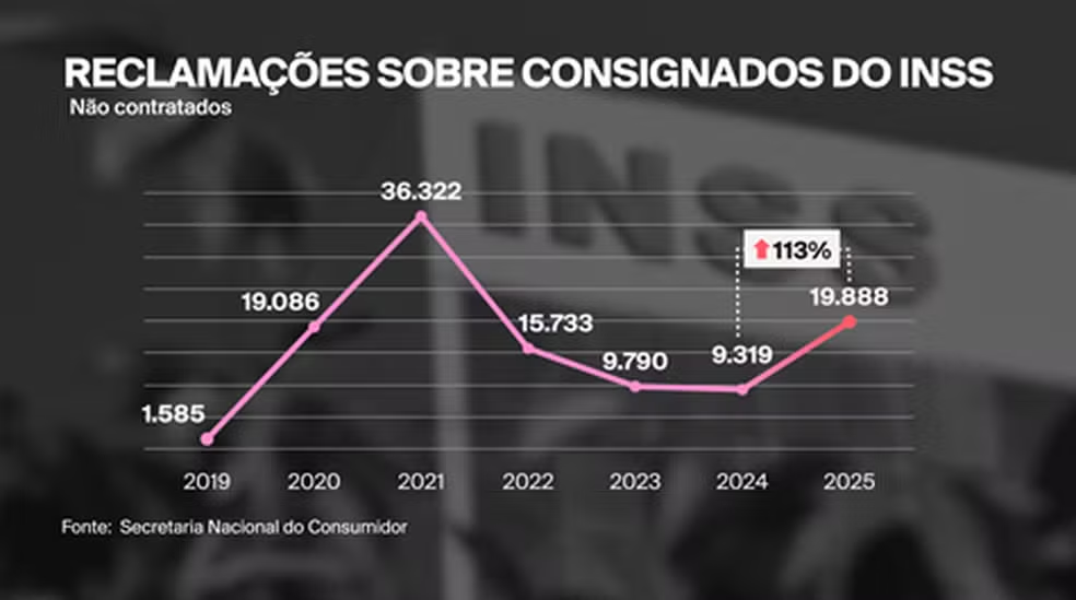 O número de denúncias de crédito consignado do INSS não contratado cresceu 113% em 2025. Foram registradas 19.888 reclamações desse tipo no site Consumidor.gov, segundo a Secretaria Nacional do Consumidor, do Ministério da Justiça e Segurança Pública.