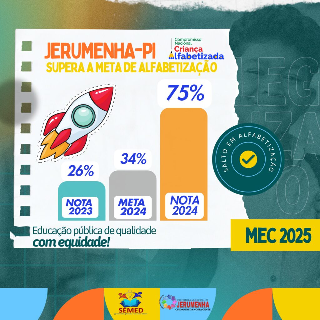 O município de Jerumenha conquista resultado recorde na alfabetização infantil. Segundo dados do Ministério da Educação (MEC), a cidade superou com folga a meta estabelecida pelo Compromisso Nacional Criança Alfabetizada para 2024, atingindo 75% de crianças alfabetizadas — mais que o dobro da meta fixada em 34%. Em 2023, o índice estava em apenas 26%.