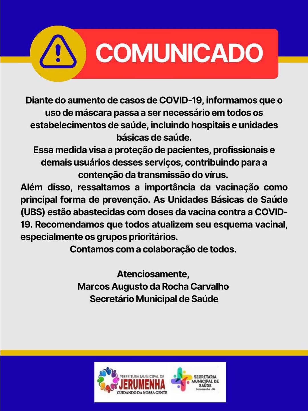 Na última quarta-feira, 20 de agosto, a Secretaria Municipal de Saúde de Jerumenha divulgou um comunicado informando que o uso de máscaras volta a ser obrigatório em todos os estabelecimentos de saúde do município, como hospitais e Unidades Básicas de Saúde (UBS). A medida foi tomada após o aumento no número de casos de COVID-19 registrados recentemente.