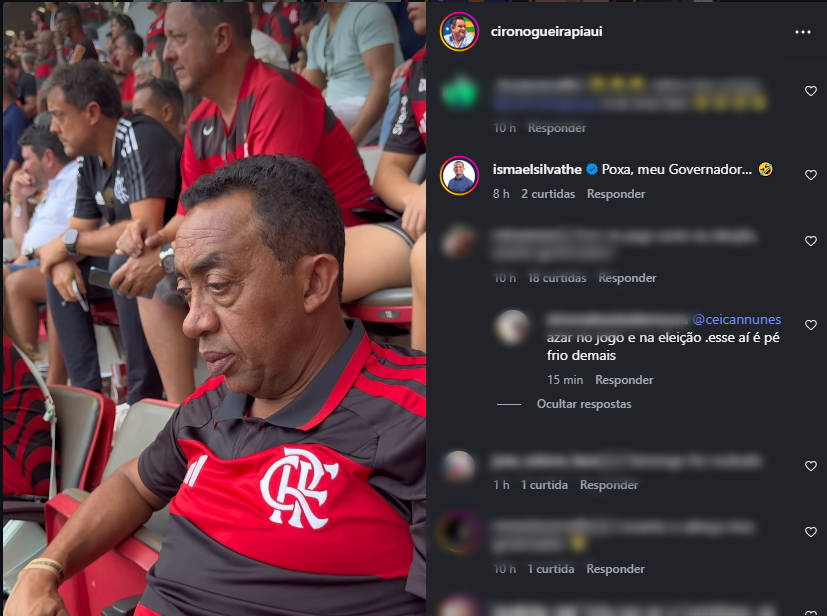 No último domingo (01), o senador Ciro Nogueira (Progressistas) compartilhou em suas redes sociais um vídeo descontraído mostrando Joel Rodrigues reagindo à derrota do Flamengo para o Corinthians na Supercopa do Brasil. Entre os comentários, um em especial despertou atenção no meio político: Ismael Silva referiu-se a Joel Rodrigues como “meu governador”, uma brincadeira que, apesar do tom informal, foi interpretada como um sinal político, reforçando os rumores sobre uma possível troca de candidato na oposição.