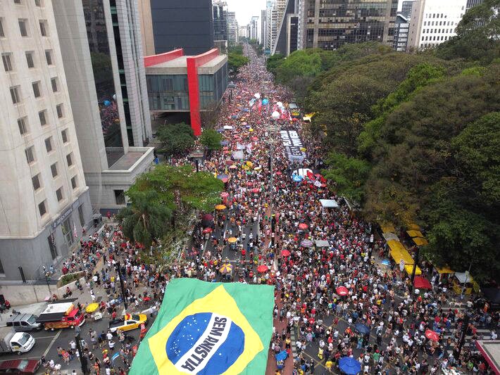 - São Paulo (SP): o ato ocorreu em frente ao Masp, na Avenida Paulista, que foi totalmente bloqueada por volta das 14h, segundo a CET. No auge, foram contabilizadas 13,7 mil pessoas, segundo o Monitor do Debate Político e a ONG More in Common, a partir de imagens aéreas analisadas por IA. A manifestação anterior, em setembro, na mesma avenida, reuniu 42,4 mil participantes.