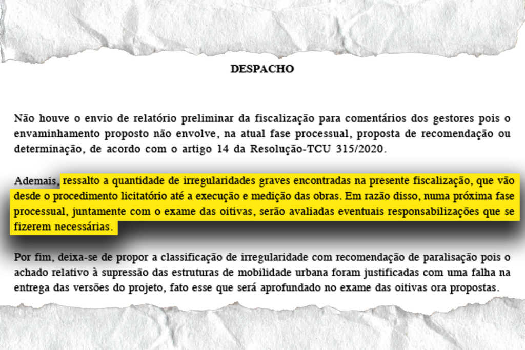 Ao enviar o relatório para o ministro Benjamin Zymler, relator do processo no TCU, o auditor-chefe da Unidade de Auditoria Especializada em Infraestrutura Urbana e Hídrica do tribunal de contas ressaltou “a quantidade de irregularidades graves encontradas na fiscalização”.