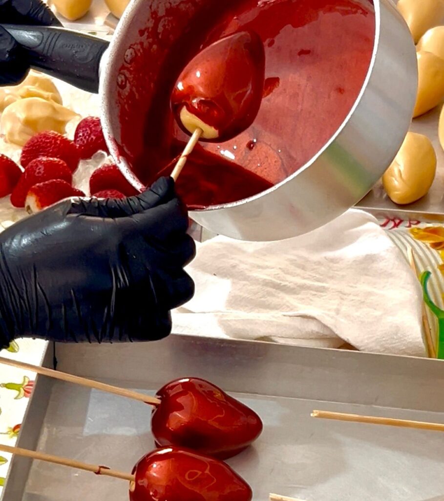 - Morango do amor tradicional – morango envolto por brigadeiro de leite ninho e coberto pela calda crocante;