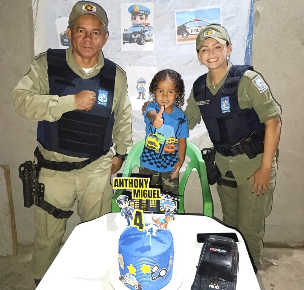 A Polícia Militar do Piauí atendeu a um pedido especial da família do pequeno Anthony Miguel, que completou 4 anos, na última terça-feira (9), em Floriano. Admirador da corporação, o aniversariante escolheu a Polícia Militar como tema da festa e sonhava em receber a visita de uma equipe durante a comemoração.
