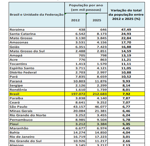 O Piauí registrou o sexto menor crescimento populacional do Brasil entre 2012 e 2025, segundo dados do Instituto Brasileiro de Geografia e Estatística (IBGE). No período, a população do estado passou de 3,21 milhões para 3,38 milhões de habitantes, um aumento de 172 mil pessoas.