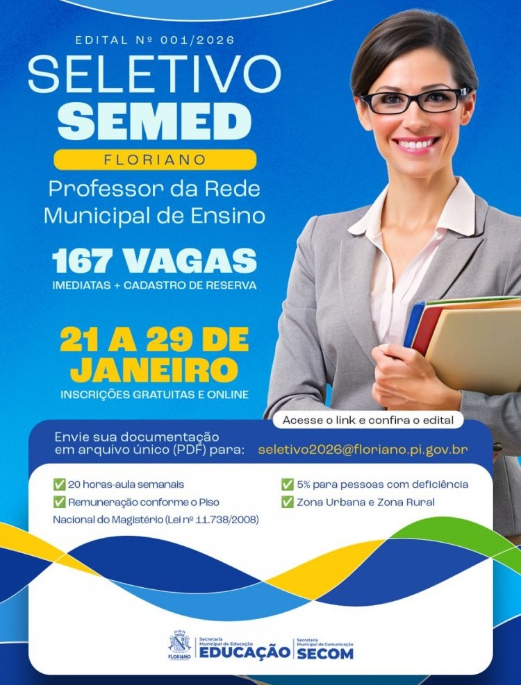 A Prefeitura de Floriano, através da Secretaria Municipal de Educação (SEMED), divulgou nesta quarta-feira, 21 de janeiro, o Edital nº 001/2026, que abre processo seletivo simplificado para a contratação temporária de professores da rede municipal de ensino. São oferecidas 167 vagas imediatas, além da formação de cadastro reserva.