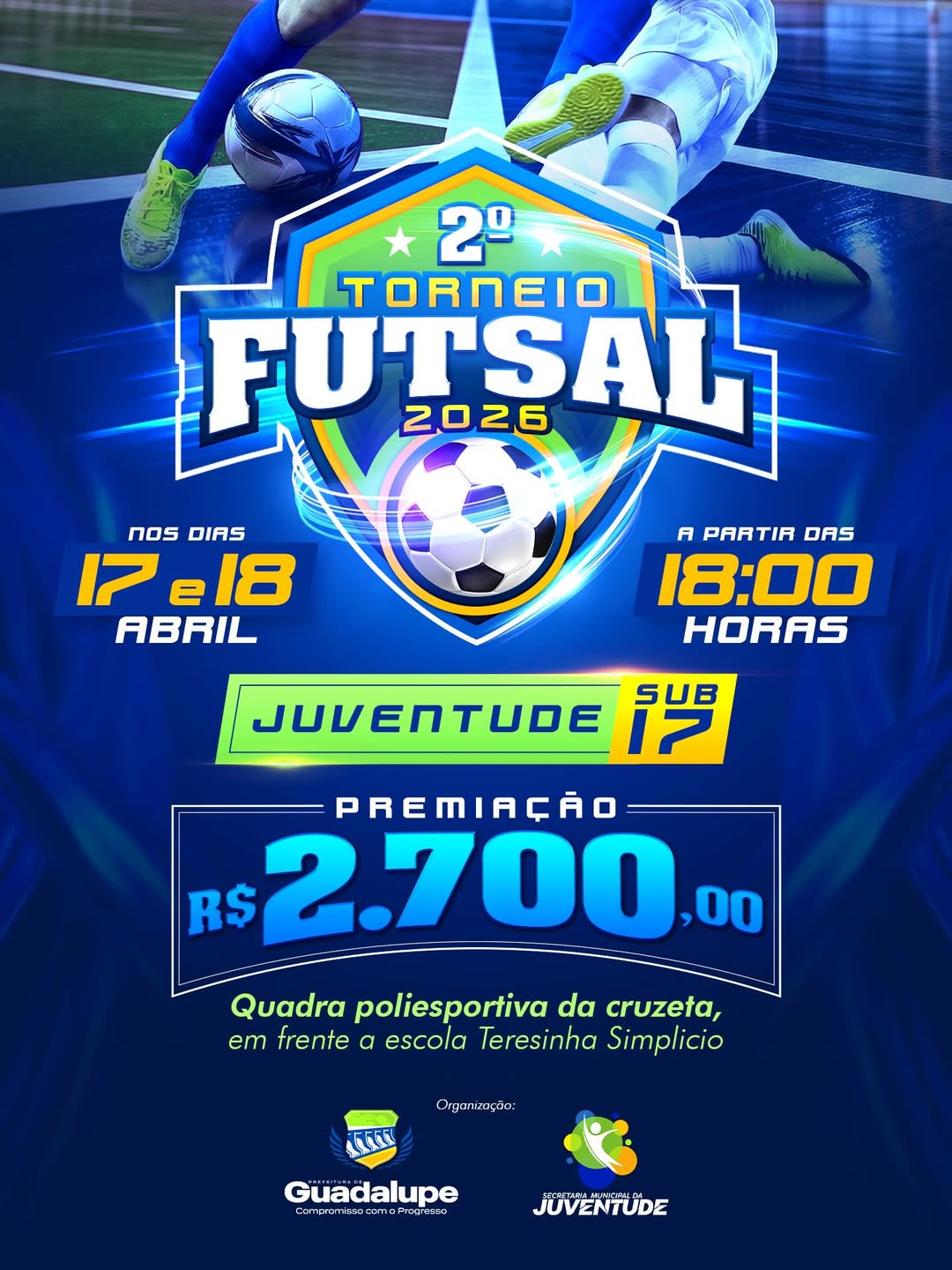 A Prefeitura de Guadalupe, por meio da Secretaria Municipal de Juventude, anunciou a abertura das inscrições para a segunda edição do Torneio da Juventude de Futsal Sub-17. A competição será realizada nos dias 17 e 18 de abril, na Quadra Poliesportiva da Cruzeta, localizada em frente à Escola Teresinha Simplício.