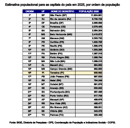 A capital piauiense atingiu a marca de 905.692 habitantes em 2025, segundo estimativa do Instituto Brasileiro de Geografia e Estatística (IBGE), divulgada nesta quinta-feira (28). Com esse número, Teresina é a 6ª capital mais populosa do Nordeste e a 16ª do país.