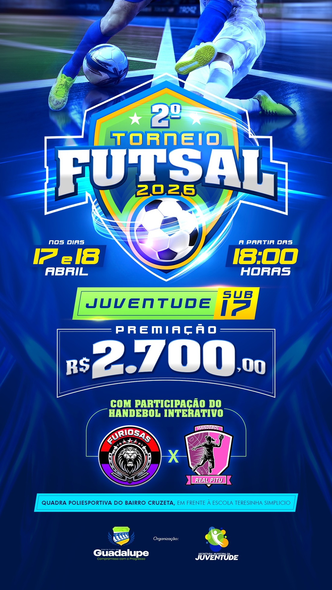 A Prefeitura de Guadalupe, por meio da Secretaria Municipal de Juventude, realizará nesta sexta-feira (17) e sábado (18) a 2ª edição do Torneio da Juventude Sub-17. A programação acontecerá na Quadra Poliesportiva da Cruzeta, em frente à Escola Teresinha Simplício, com início às 18h nos dois dias.