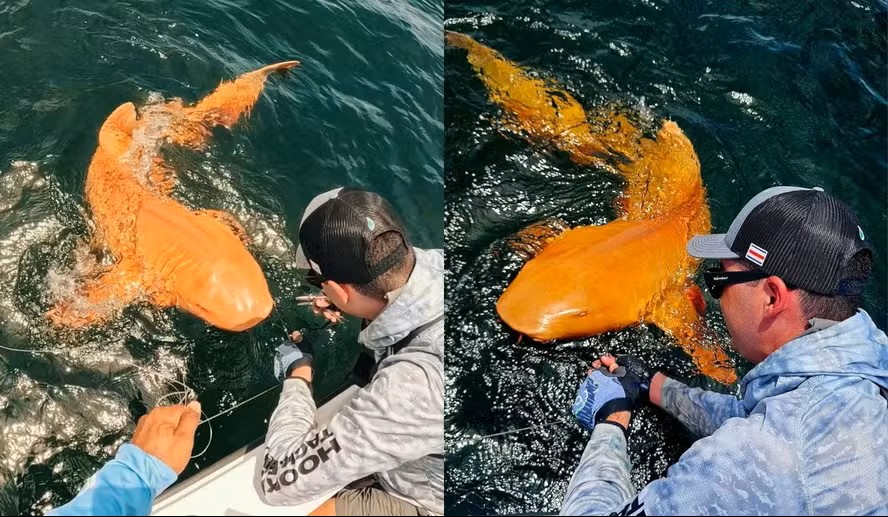 Em meio às águas cristalinas da Costa Rica, um encontro inusitado chamou a atenção de pesquisadores e pescadores: um tubarão-lixa (Ginglymostoma cirratum) com pele alaranjada intensa e olhos completamente brancos. O animal, com cerca de dois metros de comprimento, foi flagrado durante uma pescaria esportiva próxima ao Parque Nacional Tortuguero no ano passado, mas só agora ganhou notoriedade científica após a publicação de um estudo na revista Springer Nature, no início do mês de agosto, conduzido por pesquisadores da Universidade Federal do Rio Grande (FURG), da Universidade Nacional Experimental Rómulo Gallego, na Venezuela, e do Centro de Resgate de Espécies Marinhas Ameaçadas de Extinção, na Costa Rica.