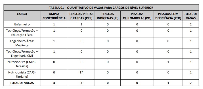 A Universidade Federal do Piauí (UFPI) lançou concurso público para contratar 12 servidores técnicos administrativos. As vagas são para oito áreas e os aprovados vão atuar nos campi de Teresina, Bom Jesus e Floriano. As inscrições estarão abertas a partir de 14 de novembro até 11 de dezembro de 2025 e o salário inicial é de R$ 3.029,90 para cargos de nível médio e de R$ 4.967,04 para cargos de nível superior.
